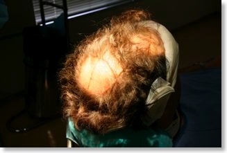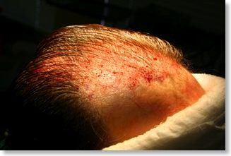 Now the fun starts. The doctor used an instrument that looks like a miniature spear to place the openings for the new hair. He used a stabbing motion as the assistants counted the number of punctures all the way up to 3000. I asked the doctor what that crunching sound was followed by a solid thunking sound. He said the crunching is the puncturing of the skin and the thunking is the point hitting the skull. The only way I can describe the crunching sound is it sounds the way I would think a termite eating wood would sound under intense amplification. Nobody else could hear it but me.